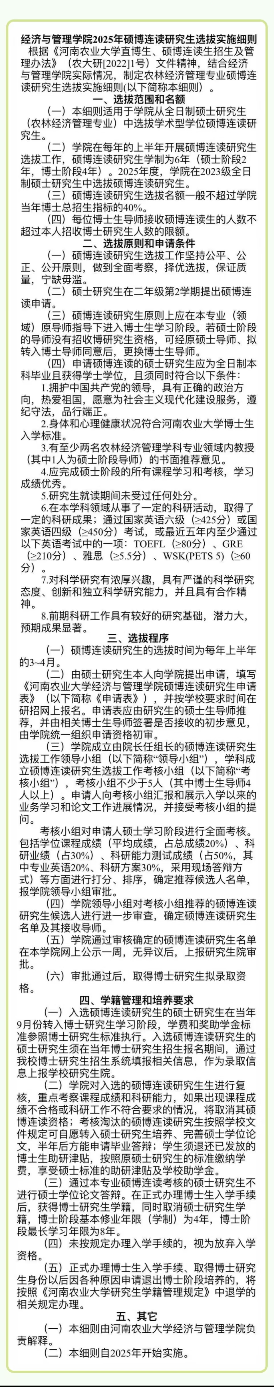 河南农业大学经济与管理学院2025年硕博连读研究生选拔实施细则