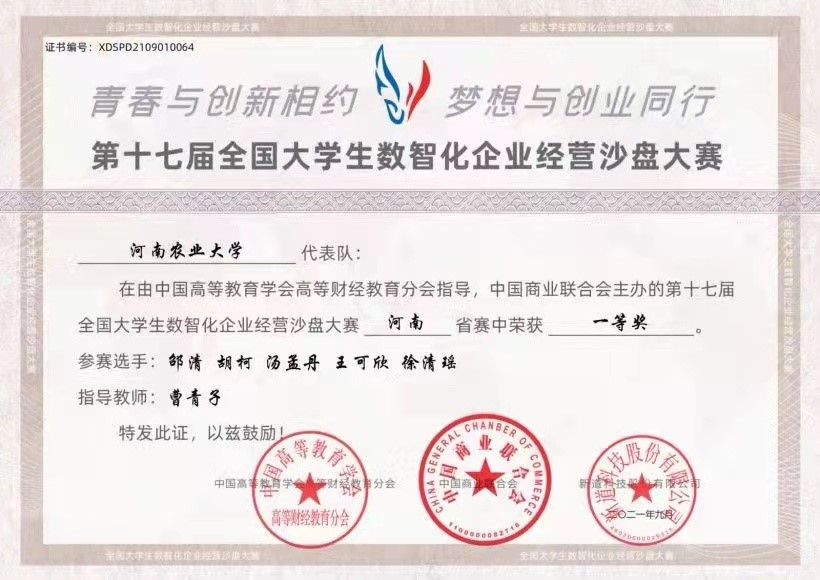 2021年10月10日,由中国高等教育学会高等财经教育分会指导,中国商业联合会主办的“第十七届全国大学生数智化企业经营沙盘大赛全国总决赛”在西华大学举行。来自哈尔滨工业大学、南开大学、河海大学、郑州大学、河南农业大学等共120多支队伍参加了比赛。由我院郑方方、曹沥方为指导教师,段晓婷、刘雨婷、魏楷迪、冯洁、张喜悦同学组成的河南农业大学代表队荣获全国二等奖。