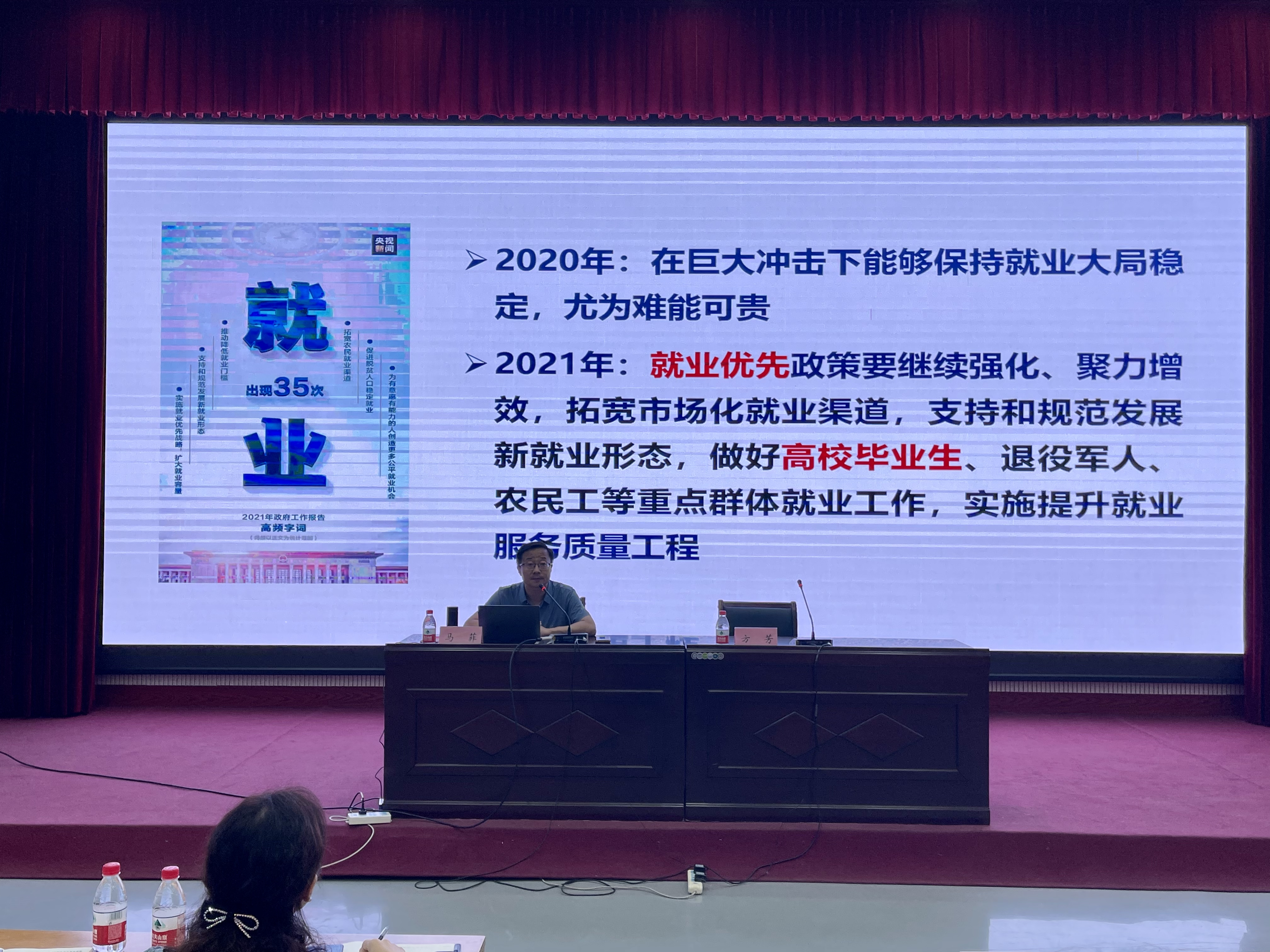 为做好学院就业引导服务系统工作,帮助大三学生尽早确定科学有效的职业发展目标,加强对学生就业的精准指导帮助,提升学生的就业意识,经济与管理学院于6月1号下午七点在大教室1举办大学生就业形势与准备专题报告会。本次报告会由马克思主义学院党委书记马菲主讲,院党委副书记方芳主持,我院18级学生积极参加。