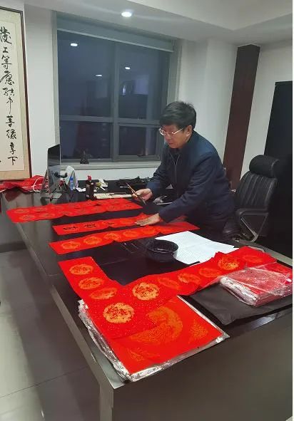 春联是我上学期间时任学院党总支书记茹光明老师写的。茹老师也是省书法家协会会员,他和唐华仓老师、刘全峰老师在腊月二十六一起专门来看我,并挥毫泼墨,为我公司的员工还有每个办公室书写了十几副春联。看着这一幅幅春联,我心里涌现出无限的暖意和感动,也勾起了我大学期间许多难忘的记忆,在农大经贸学院的点点滴滴犹如一汪泉水源源不断地涌现在我的脑海。