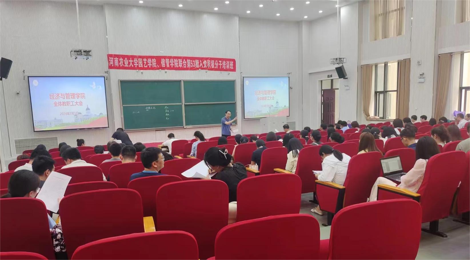 7月1日,我院于龙子湖校区繁塔楼CD之间一层大教室5召开全体教职工大会。学院领导班子及全体教职工参加此次会议,会议由院党委书记王宏立主持。