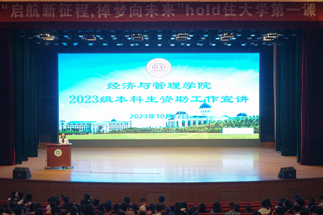 大会伊始,余月圆老师依次从入党流程、党员基本标准条件、发展指标等方面为大家介绍《经济与管理学院发展党员办法》,使得新生了解党员知识,为学生的入党道路指明方向。随后,由袁颖老师进行2023级本科生资助工作宣讲会。她详细讲解了学校和学院的资助政策,重点围绕资助类型、奖励标准、申请条件、评选流程等方面,系统阐明了高校资助工作体系。