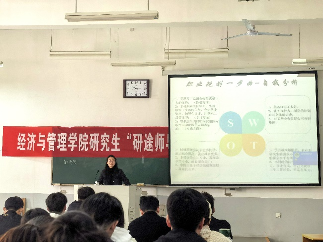 赵会杰老师先简要概括了同学们目前可能存在的学习、生活、就业等方面的问题,并以自身求学经历为例,给予了同学们宝贵的经验与建议。赵会杰说,研究生做好职业规划很重要,并将职业规划分解为三步曲,分别是自我分析、短期规划、实施方案,强调同学们要通过自我认识,自我控制,自我超越来一步步的实现发展目标。