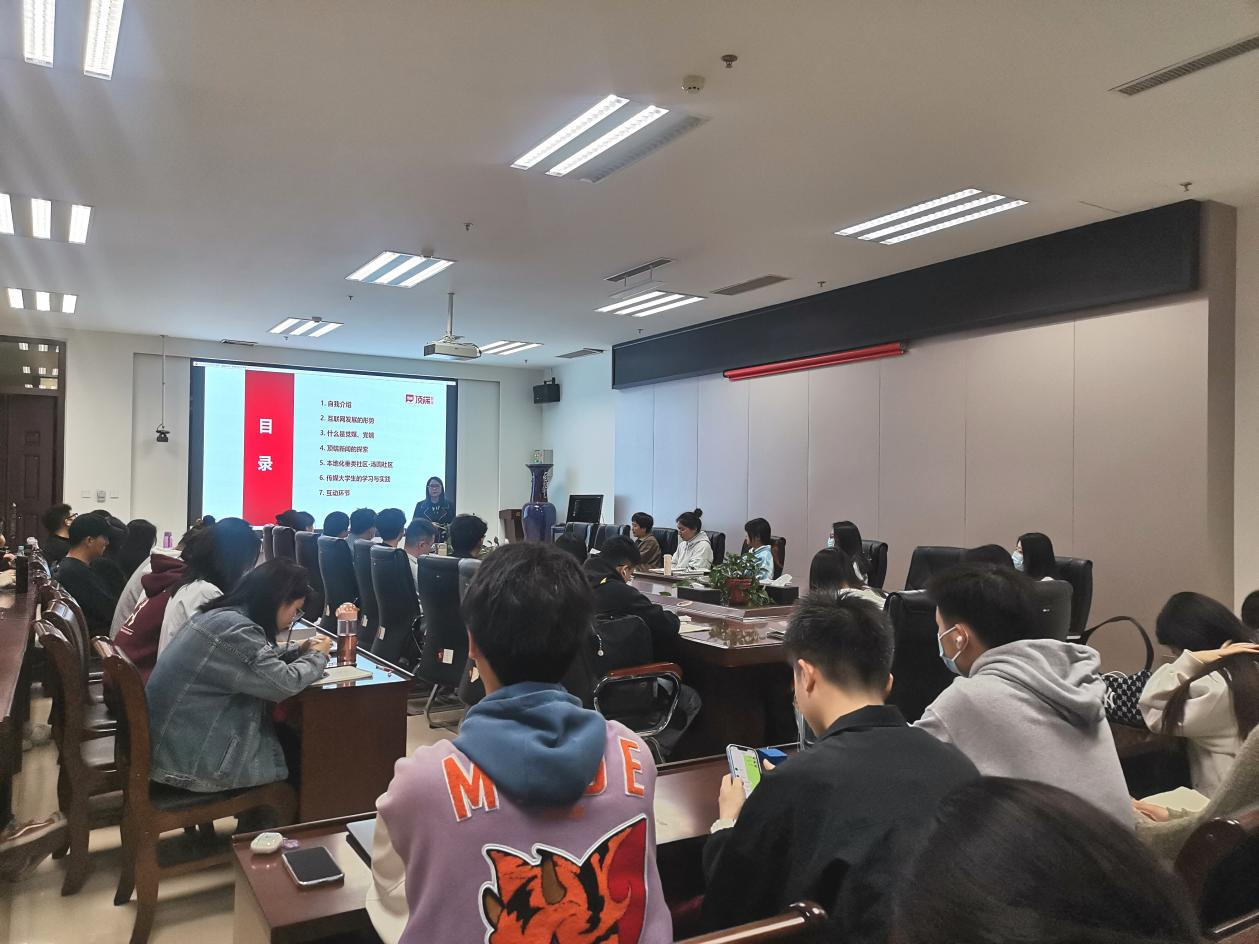 薛老师结合自身工作经历,生动活泼地向同学们阐释了新媒体时代的媒介素养,并通过一些实例来生动说明新闻稿写作方面的技巧规范以及注意事项,指出新闻稿需要贴近人们的生活。随后,她向同学们介绍互联网媒体概念及其传播方式,阐述了互联网的运营手段及其发展形势。在讲到党性互联网媒体时,着重讲述了党媒、党端的含义和属性,告诉大家顶端新闻作为党媒,立志扎根河南,这是顶端的初心所在、使命所在。在讲述过程中,薛老师还多次与同学们展开良好互动,整场讲座氛围诙谐幽默、妙趣横生。在交流环节,针对同学们提出的如何选择考研和就业,求职与面试过程中的注意事项等问题,薛老师和贺老师做了详细解答,帮助同学们拓展就业视野,为未来的职业选择与进一步的生涯规划做好准备。