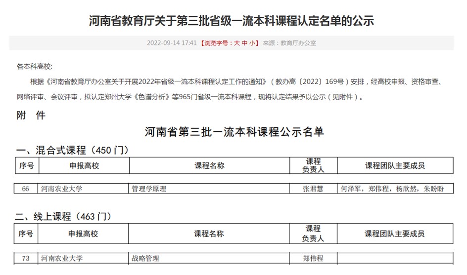 日前,河南省教育厅发布了《关于第三批省级一流本科课程认定名单的公示》,我院有2门课程被认定为省级一流本科课程,其中,《管理学原理》课程获得线上线下混合式一流本科课程认定,《战略管理》课程获得线上课程一流本科课程认定。