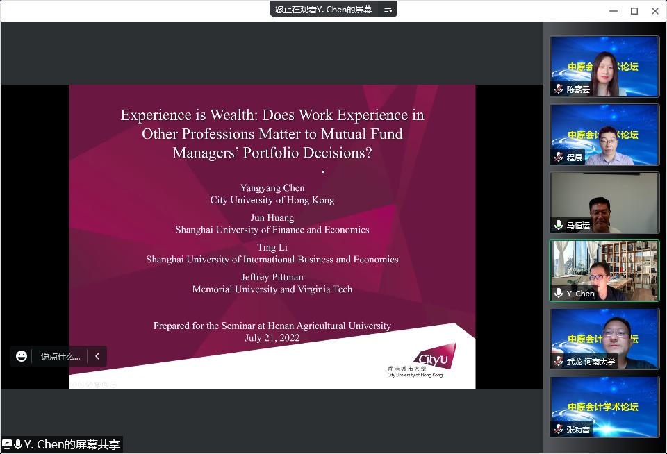7月21日,香港城市大学陈旸旸教授应邀为我院师生作了题为“Experience is Wealth: Does Professional Experience Matter in Mutual Fund Managers' Portfolio Decisions?(经验就是财富——其他行业的工作经验对共同基金经理的投资组合决策是否重要?)”的线上报告。报告会由我院院长、教育部长江学者特聘教授马恒运主持,兄弟院校和我院部分教师、我院部分研究生参加。