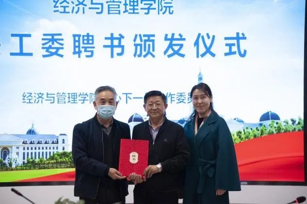 会议第一项是举行关工委聘书颁发仪式。方芳宣布聘请原经济与管理学院戴强老师为关工委委员,王宾齐为其颁发聘书并合影留念,并共同表示将会坚持立德树人的正确方向,团结教育下一代听党话、跟党走,支持和帮助青年师生成长、成才。