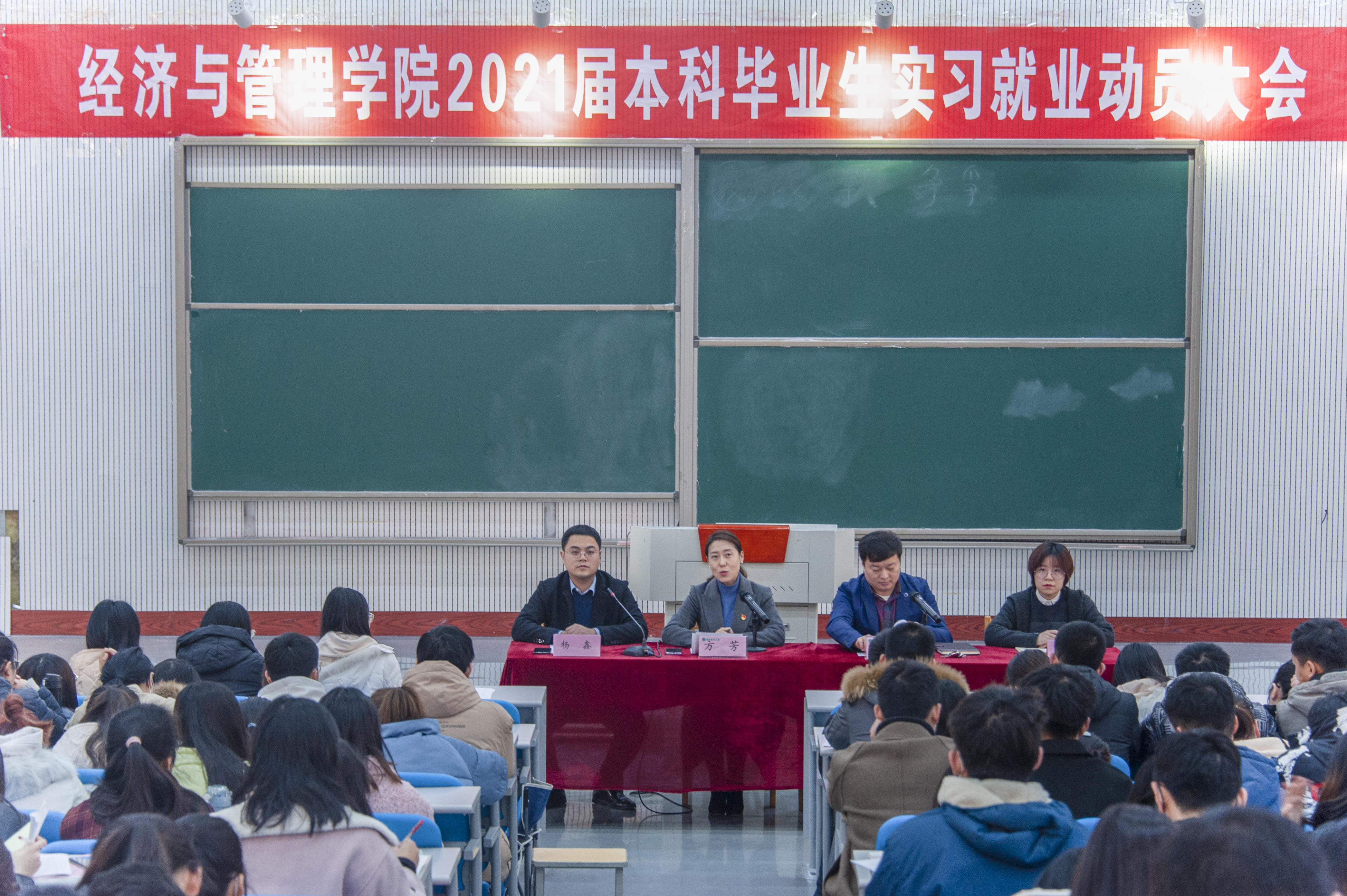 为了推进2021届毕业生实习就业工作,指导学生毕业实习,引导正确就业观念,增强学生就业主动性,12月10日,经济与管理学院2021届本科毕业生毕业实习就业动员大会于繁塔楼大教室二举行。学院党委副书记方芳、副院长刘瑞峰、17级院团委副书记杨鑫、教学干事李广瑜出席。学院2021届全体毕业生参加此次动员大会。本次动员大会由杨鑫主持。