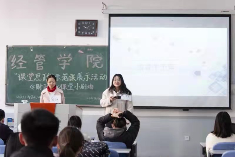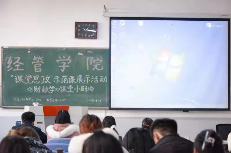 户外“天寒色青苍”,教室内却因师生的互动而倍感温暖 。经济与管理学院课程思政示范课展示活动-《财政学》课堂小剧场正在火热进行中。18级经济学专业的同学们根据所学知识自创、自导、自演情景剧,依次上台表演了《交保风波》、《大学生阿伟的病房奇遇》、《太后的新政》等八个小剧场节目,他们以诙谐幽默的语言、生动风趣的表演,深入浅出地说明了商业保险与社会保险的区别以及保险对人身的重要意义等。期间,刘宁老师通过对财政学小剧场的点评,介绍了我国财政发展的现状及财政法发展脉络,理性地阐释了中国特色社会主义财政理论与制度,将“课堂思政”浸润到每个细节,使学生扎实掌握财政学基本概念、基本理论和基本方法。