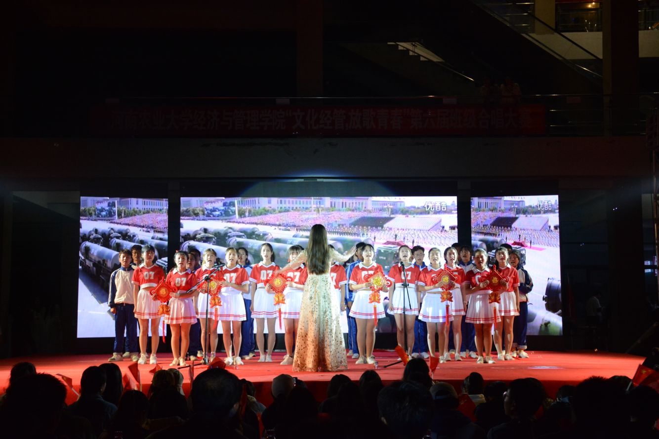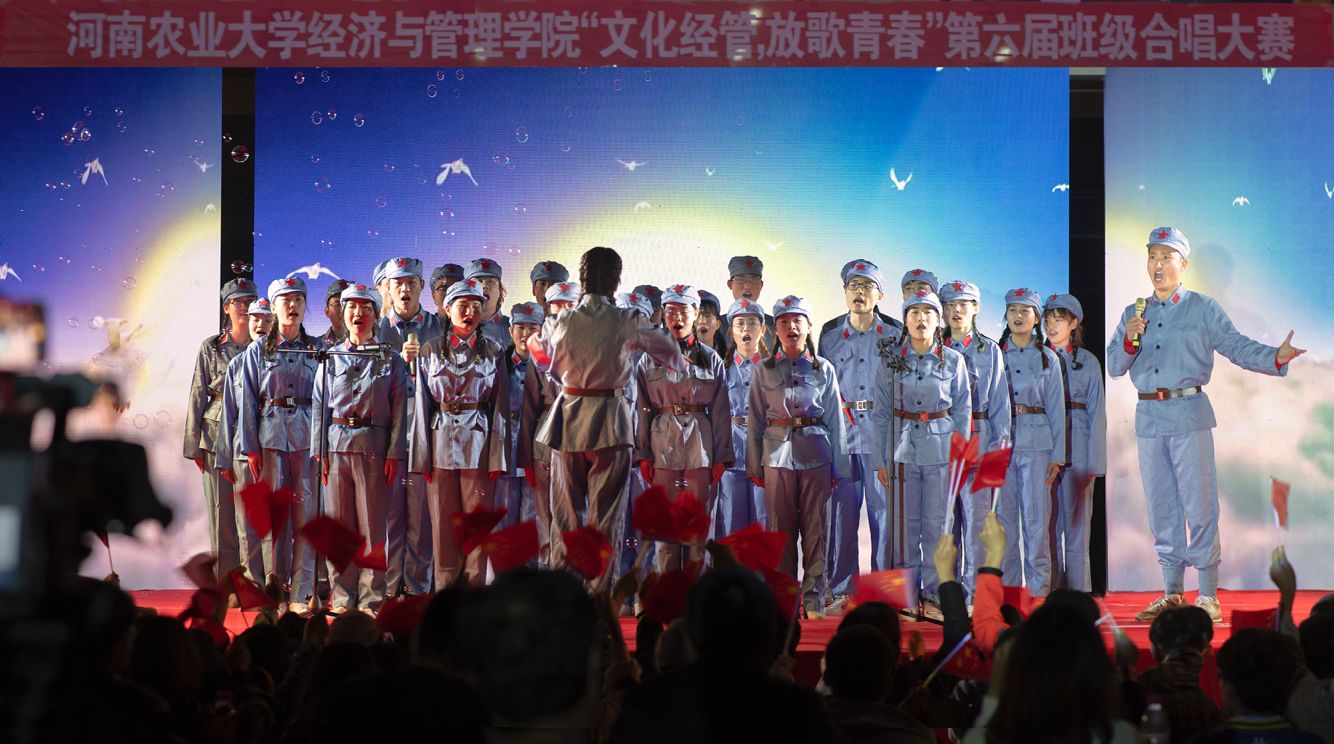 伴随着经管师生代表的超燃快闪《我和我的祖国》,整场比赛拉开了序幕,进入决赛的16个参赛班级依次登台演唱,他们用一曲曲高亢嘹亮的歌声唱出了当代大学生的朝气蓬勃。《改革春风吹满地》余音缭绕,轻灵飘逸,以诗意的方式歌颂了祖国春天的美好;《红旗飘飘》表达了青年大学生坚守一方阵地、守卫祖国红旗的情怀;《百年农大,青春献礼》用激情澎湃的声音表达着莘莘学子对青春的眷恋,对母校的情怀……一首首耳熟能详的经典歌曲引领全体师生,重温了在党的领导下中华儿女共同建设伟大祖国的光辉历程,唱出了大家“青春心向党 建功新时代”的坚定决心和深厚感情。