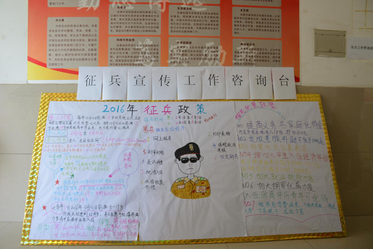大学生是国家的宝贵人才,征集大学生入伍,是新时期国防和军队现代化建设的需要,我院积极响应国家的大学生征兵政策,开展征兵宣传工作咨询活动。活动现场,院团委委员向前来咨询的学生讲解了军队现代化建设对高素质人才的需求、大学生服兵役的法律义务、国家的相关优惠政策,详细介绍了征兵政策的变化、入伍条件、时间安排、报名流程、服役待遇等问题,使同学们提前了解军营情况和部队对大学生入伍的各种优惠政策和优待条件,帮助同学们树立了从军报国的志向;同时,现场工作人员向前来咨询的学生发放征兵宣传单,鼓励大学生踊跃报名,接收祖国挑选,圆自己的从军梦。