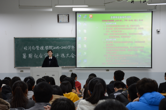 11月6日,经济与管理学院2015-2016学年暑期社会实践评选大会在繁塔楼D-208举行。院党委组织员张倩、院团委老师张嫄嫄到场出席。我院13支优秀社会实践团队参加此次评选大会。