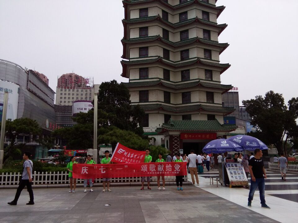 次日,团队通过一张张生动真实的照片、一篇篇深刻犀利的文章向民众普及党的基本知识,重温党的光辉历程。为扩大活动号召力与影响力,增强群众参与度,团队一行人在二七广场举办唱红歌活动。高亢嘹亮的歌声回荡在广场上空,过往群众深受感染,纷纷加入合唱。随后,团队挂出"庆七一 颂歌献给党"的横幅,举办万人签名活动,发放爱党知识宣传册。通过风趣幽默的插图和言简意赅的描述,使民众对党性常识有了更为直观的理解。现场气氛活跃,活动反响热烈。