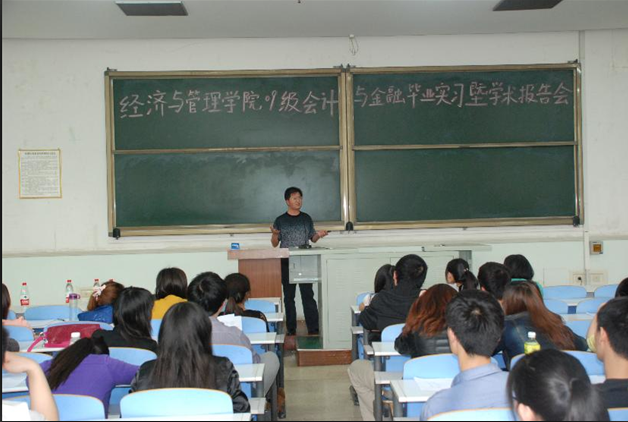 2012年4月19日下午,经济与管理学院09级会计、金融管理与实务专业毕业实习动员暨学术报告会在校区工程楼101室举办。学院邓俊锋副院长、戴强副教授、孟昭智教授、团委副书记王金铎、院办老师李旸参加了本次报告会。报告会由团委副书记王金铎主持。