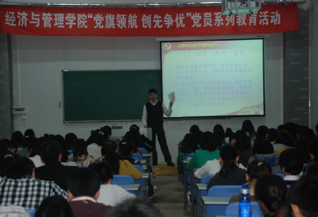 2012年4月18日晚7点,经济与管理学院党员系列教育活动在新校区菊坛园大十教室拉开帷幕,院党委副书记李建群、团委书记郭娟及党委秘书张倩老师出席了本次活动,学院学生党支部全体成员参与并接受了此次党员教育活动,会议由郭娟老师主持,李建群书记主讲。