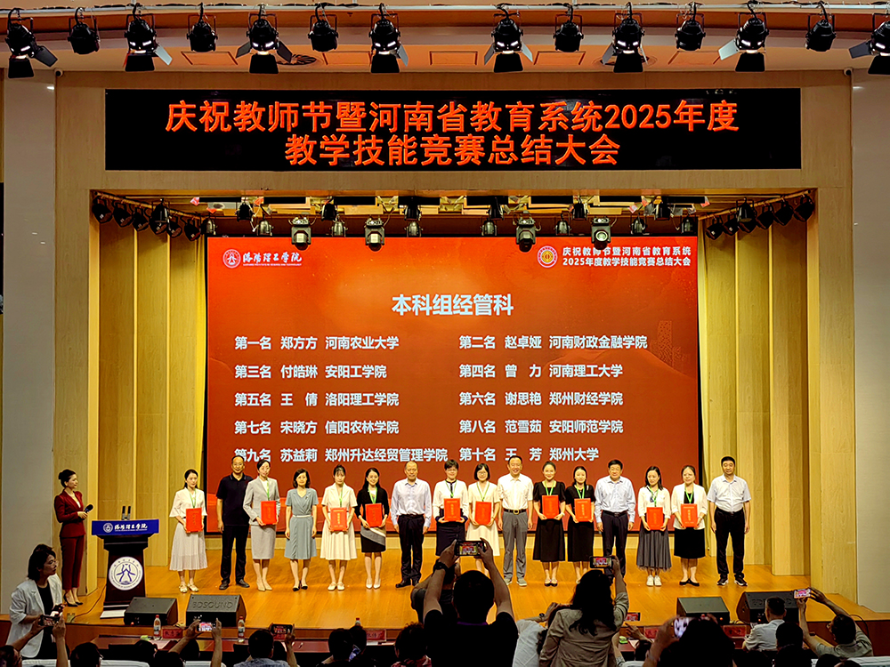 8月28日至31日,由河南省总工会、河南省教育厅主办,河南省教科文卫体工会和洛阳理工学院承办的河南省教育系统2025年教学技能竞赛本科组现场赛决赛在洛阳举行。我院郑方方老师荣获经管组特等奖(全省第一名),充分展现了我院教师队伍的教学实力与育人风采。